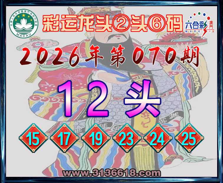 070期:《彩运龙头》  ♣️②头⑥码 ♣️【12头】开:马25准上榜高手
